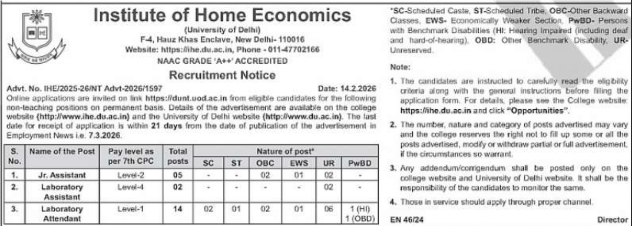 The Institute of Home Economics under University of Delhi has released Advertisement No IHE/2025-26/NT Advt-2026/1597 for permanent non teaching staff recruitment. Candidates can submit their online application through the official DU recruitment portal before the deadline.