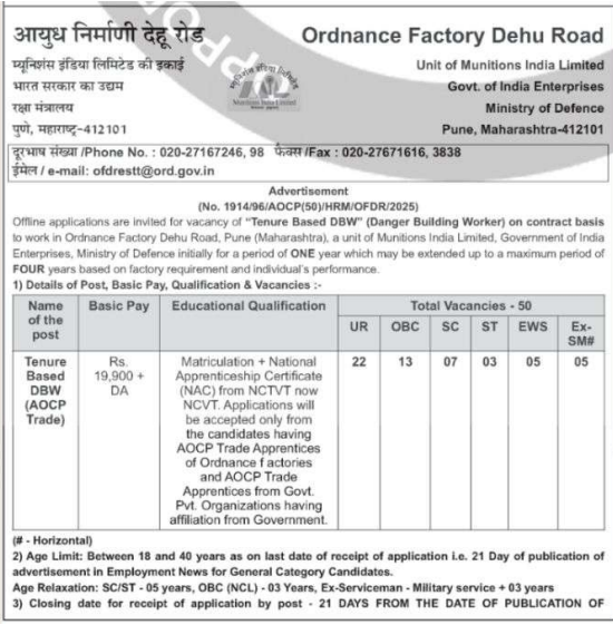 The Ordnance Factory Dehu Road has released 50 vacancies for the post of Tenure Based DBW (Danger Building Worker).