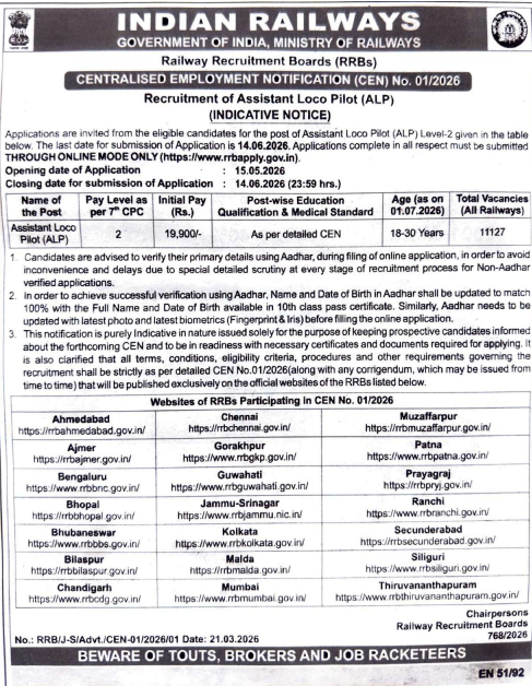 This latest announcement by the Railway Recruitment Boards brings 11,127 Assistant Loco Pilot vacancies across India. Candidates with technical qualifications can apply through the online mode between 15 May and 14 June 2026.