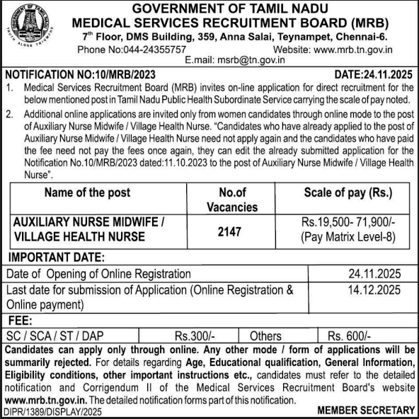 Medical Services Recruitment Board, Tamil Nadu Auxiliary Nurse Midwife / Village Health Nurse (Women) 2147 12TH Pass or ANM Certificate 24 November 2025 – 14 December 2025 mrb.tn.gov.in